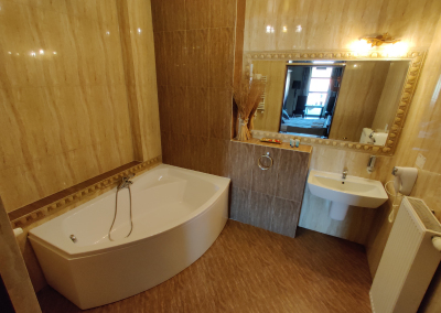Na drugim piętrze mieszczą się przestronne pokoje o powierzchni od 15 do 25 metrów. Urządzone nowocześnie w modnej kolorystyce beżowo-czekoladowej, pozwalające na spokojny wypoczynek po trudach dnia codzennego jak również po długiej podróży. Wszystkie pokoje posiadają łazienkę utrzymaną podobnej tonacji co pokój, wyposażoną w kabinę prysznicową. Na tym piętrze posiadamy pokoje 1, 2, 2 z podwójnym łóżkiem 3, 4 osobowe.